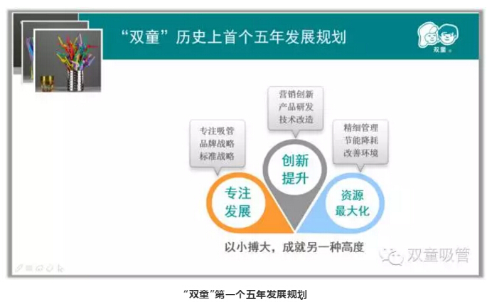 2005年,“雙童”提出了第一個(gè)五年發(fā)展規劃,其中提到了三個(gè)關(guān)鍵詞“專(zhuān)注發(fā)展”、“創(chuàng )新提升”、“資源最大化”,在這期間,“雙童”始終堅持“以小博大”的理念,沒(méi)有貪大求全,急功近利,專(zhuān)注做好一根吸管!