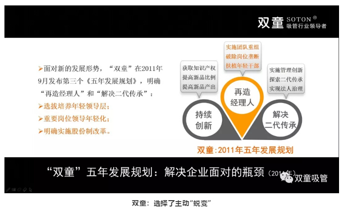 “雙童”選擇了主動(dòng)“蛻變”,并在2011年發(fā)布了第二個(gè)《企業(yè)五年發(fā)展規劃》,提出“持續創(chuàng )新,再造經(jīng)理人,解決二代傳承”3個(gè)關(guān)鍵詞。