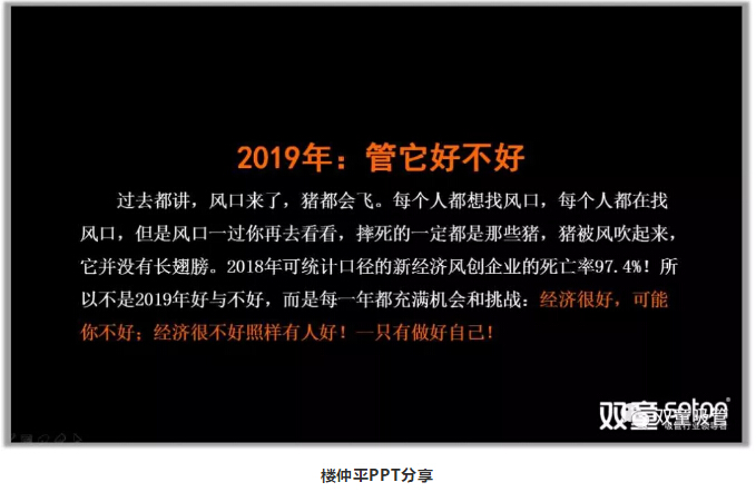 首先,樓仲平以“2019,最近十年最難的一年,未來(lái)十年最好的一年”一句話(huà)展開(kāi)分享,并引導大家認知:改革開(kāi)放四十年,好做的、能做的、輕輕松松、容易做的都給我們做完了。環(huán)境逆轉下、紅利消失下,留下給我們的當然會(huì )越來(lái)越難做。所以,在這個(gè)時(shí)代下,做什么并不是那么重要,重要的是要怎么做。我們感受到一定是:“逆風(fēng)”中行進(jìn)!