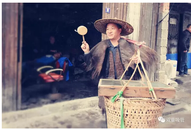 這是“雞毛換糖”人挑貨郎擔的場(chǎng)景……