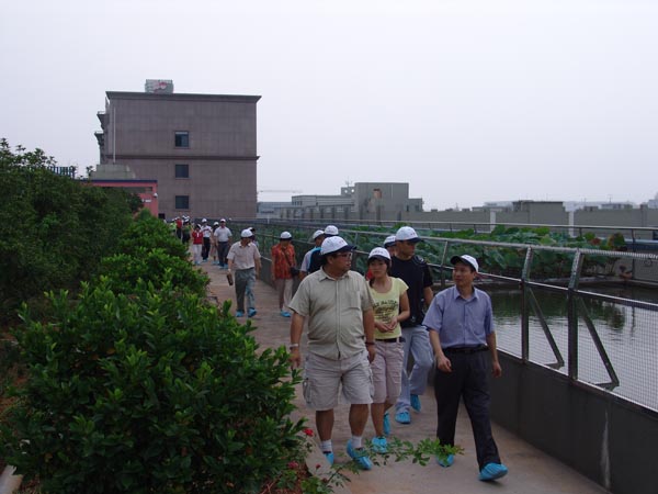 上圖為公司張國?。ㄓ乙唬└笨偨?jīng)理向企業(yè)代表團介紹循環(huán)經(jīng)濟屋頂綠化節能降耗情況