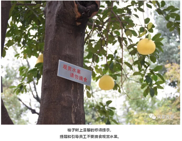 其實(shí),為了“雙童”的生態(tài)和美觀(guān),公司明確柚子是觀(guān)賞性水果,每棵柚子樹(shù)上都有“觀(guān)賞水果,請勿摘食”的字樣,提醒和引導員工不要摘食觀(guān)賞水果。