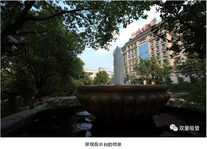 經(jīng)過(guò)九曲橋,來(lái)到湖邊的景觀(guān)疊水臺,一道噴泉沖天而起,散開(kāi)漫天花雨,沖入水池里的水不停地翻滾著(zhù),倒影迷幻,美麗極了!