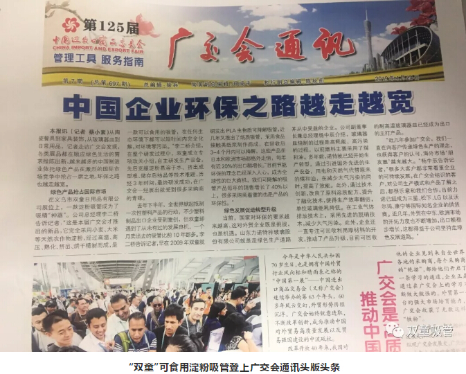 “雙童”可食用淀粉吸管除了吸引了大批客商之外,也引起了媒體朋友們的關(guān)注?!半p童”可食用淀粉吸管作為中國企業(yè)環(huán)保案例登上了廣交會(huì )通訊報的頭版頭條,在廣交會(huì )上一炮打響!