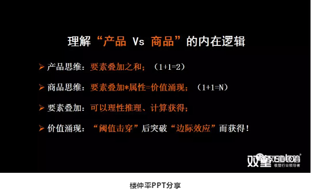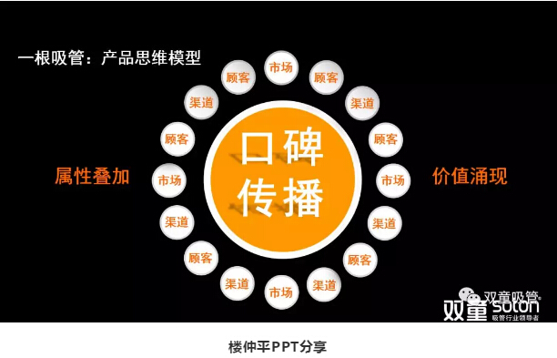 接著(zhù),樓仲平引導大家思考“產(chǎn)品 VS 商品”的關(guān)系,在這個(gè)模型中,產(chǎn)品本身(一根吸管)只是組成“商品”的基礎核心,是最基本的要素疊加之和,1+1=2。