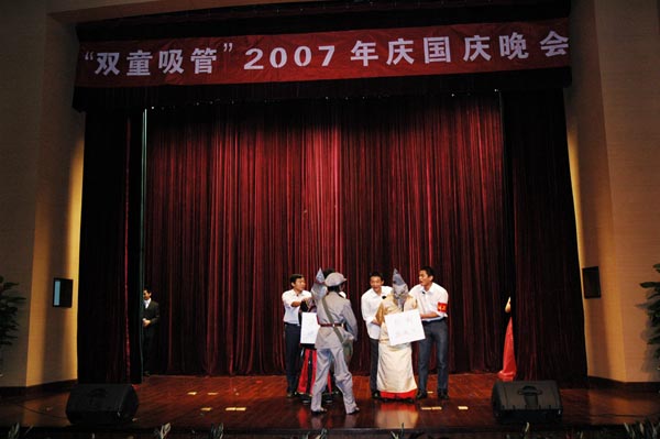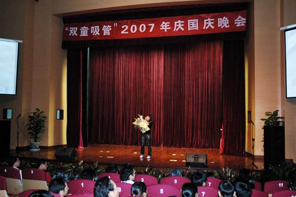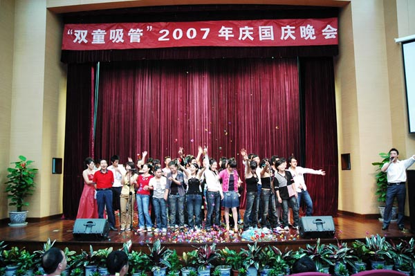 2007年10月1日,雙童公司舉辦了慶國慶晚會(huì ),各級領(lǐng)導和嘉賓、全體員工、部分員工家屬都參加了本次活動(dòng),晚會(huì )包含13個(gè)歌唱、5個(gè)舞蹈、3個(gè)小品、2個(gè)相聲、2個(gè)游戲等節目,經(jīng)過(guò)員工自編自演、精心排練和準備,得到員工一致好評。