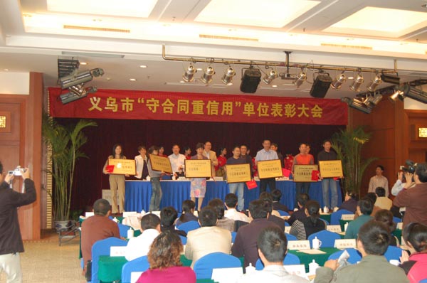 2007年10月18日上午辦公室主任盧程航代表公司參加義烏市“守合同重信用”單位表彰大會(huì ),義烏市政府副市長(cháng)季金甫、義烏市工商局邱增法局長(cháng)、工商局陸立權、洪金有、龔淑娟副局長(cháng)等領(lǐng)導參加了會(huì )議。