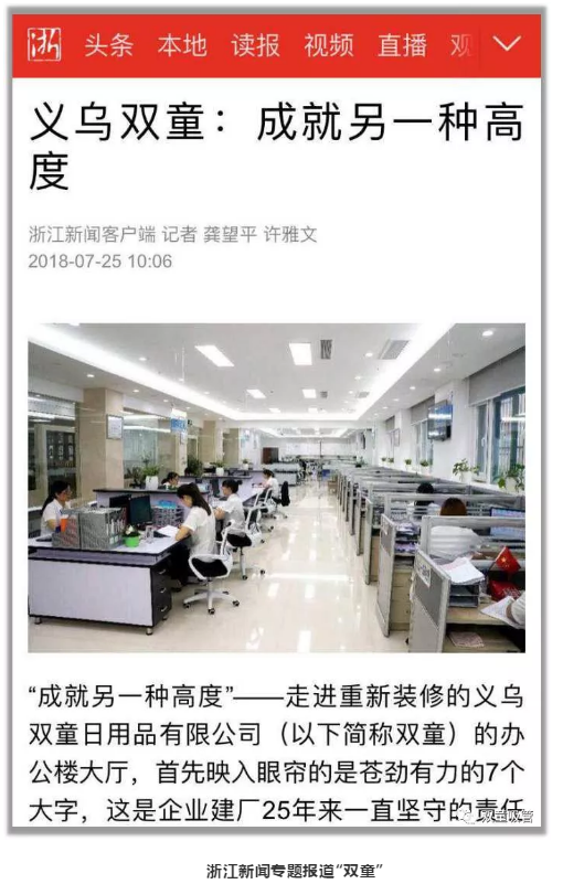 “成就另一種高度”——走進(jìn)重新裝修的義烏雙童日用品有限公司(以下簡(jiǎn)稱(chēng)“雙童”)的辦公樓大廳,首先映入眼簾的是蒼勁有力的7個(gè)大字,這是企業(yè)建廠(chǎng)25年來(lái)一直堅守的責任和使命。