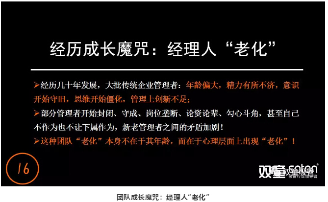 “雙童”為例:在公司創(chuàng )辦初期聘用的一批管理層,在2010年前后,大部分管理人員逐漸出現:依托于慣性思維,憑經(jīng)驗用老方法解決新問(wèn)題,不愿意學(xué)習等問(wèn)題,團隊的成長(cháng)也因此遇到了瓶頸。