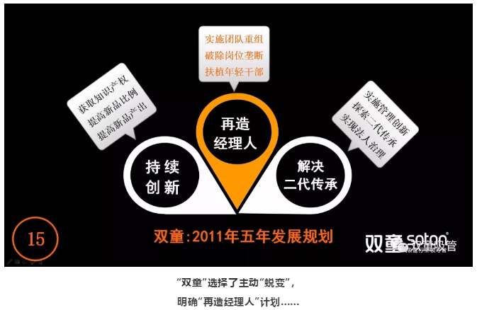 基于上述瓶頸,公司在2011年發(fā)布了第三個(gè)《企業(yè)五年發(fā)展規劃》,明確“再造經(jīng)理人”計劃,明確領(lǐng)導層更替:選拔培養年輕領(lǐng)導層、重要崗位領(lǐng)導年輕化、明確實(shí)施股份制改革,慢慢解決管理層老化問(wèn)題!