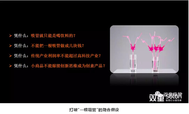 答:在生活中,許多人都容易陷入自身的“隱含假設”中,認為吸管這類(lèi)產(chǎn)品就是“低、小、散、弱”,但“雙童”卻在2005年提出:吸管不僅僅是用來(lái)喝飲料的,這一個(gè)認知就打破了“吸管只是用來(lái)喝飲料”這個(gè)“隱含假設”。