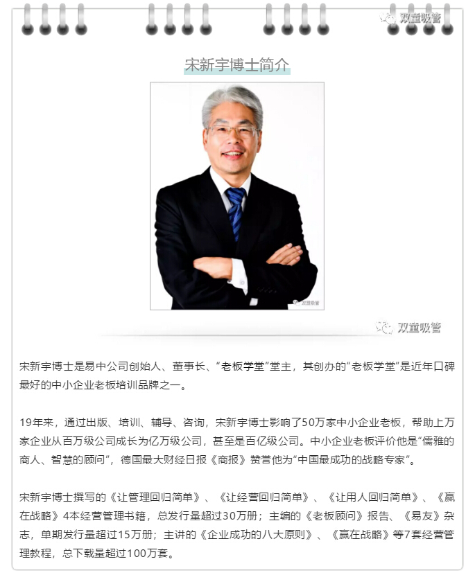 其實(shí),“雙童”樓仲平與老板學(xué)堂的淵源頗深。早在2012年,樓仲平就關(guān)注到了宋新宇博士的管理理念,購買(mǎi)了他撰寫(xiě)的《讓管理回歸簡(jiǎn)單》,讓“雙童”行政人員學(xué)習。