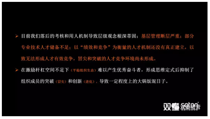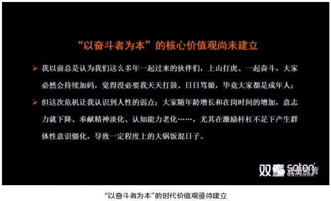 緊接著(zhù),樓仲平開(kāi)始解惑:“‘雙童’“家文化”是建立在員工和企業(yè)共同創(chuàng )造的基礎之上,是所有員工以創(chuàng )造價(jià)值獲得生存為最高追求的平臺,而不是休閑和養老的地方。此次改革之所以建立“以?shī)^斗者為本”,就是為了以激發(fā)大家的積極性,創(chuàng )造更高的價(jià)值,從而讓你們拿到更高的工資,從而讓管理者拿到更高的工資,從而讓企業(yè)獲得更好的發(fā)展!”