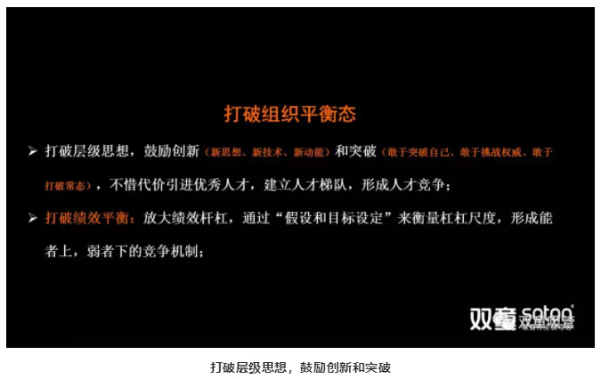 最后,樓仲平也希望通過(guò)此次改革,能讓“雙童”的管理發(fā)揮人性的激情,打破教條和大鍋飯,打破原來(lái)的死氣沉沉和思維僵化,讓擔當者多得,讓逃避者少得,讓無(wú)能者出局,讓后來(lái)者上位,讓無(wú)畏者居高位,讓優(yōu)秀的員工和管理者得到應有的肯定!