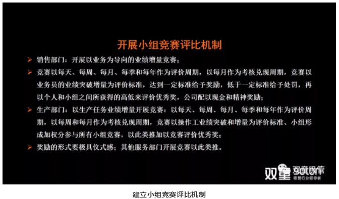 生產(chǎn)部門(mén):以生產(chǎn)任務(wù)業(yè)績(jì)增量開(kāi)展競賽;以每天、每周、每月、每季和每年作為評價(jià)周期,以每周和每月作為考核兌現周期,競賽以操作工業(yè)績(jì)突破和增量為評價(jià)標準、小組形成加權分參與所有小組競賽,以此類(lèi)推加以競賽評價(jià)優(yōu)秀獎;