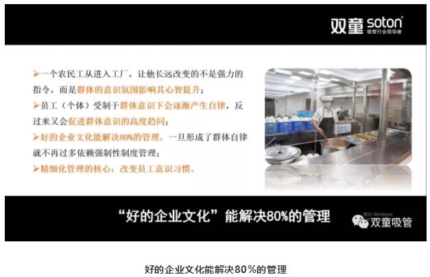 由此,我們認知到:質(zhì)量的改善僅有硬件和制度是不夠的,更需要不斷提升每一位員工的素養,形成高度統一的群體意識 。自此,“雙童”質(zhì)量文化開(kāi)始逐步完善,通過(guò)硬件環(huán)境和文化氛圍潛移默化地影響員工,用精細化管理的方式改變員工的意識和習慣。