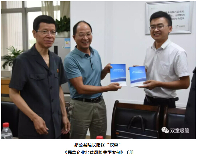 會(huì )上,胡公益院長(cháng)也向樓仲平了解企業(yè)生產(chǎn)經(jīng)營(yíng)過(guò)程中的司法需求,并贈送《民營(yíng)企業(yè)經(jīng)營(yíng)風(fēng)險典型案例》手冊。同時(shí),“雙童”樓仲平也對胡公益院長(cháng)一行人的親自到訪(fǎng)、上門(mén)服務(wù)及贈送《民營(yíng)企業(yè)經(jīng)營(yíng)風(fēng)險典型案例》手冊表示十分感謝!