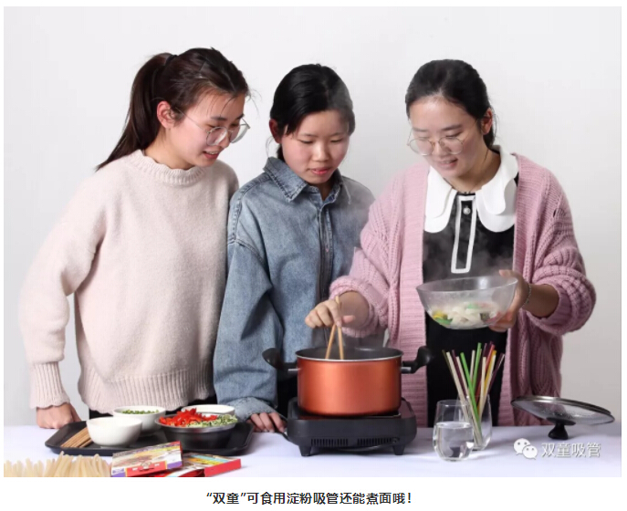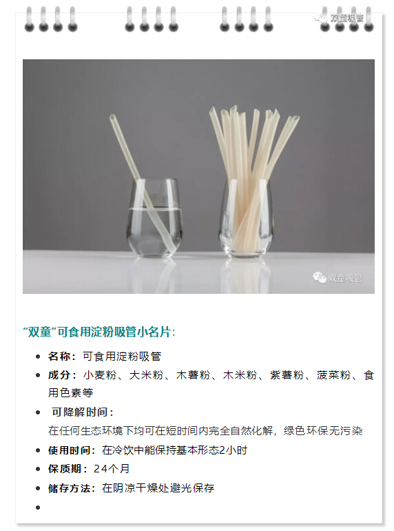 “雙童”可食用淀粉吸管完全采用小麥、大米、玉米、木薯、土豆等天然農作物淀粉,經(jīng)高溫、高壓、熟化、擠出、烘干精制而成!
