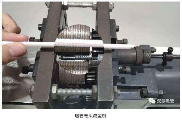 再通過(guò)這臺彎頭成型機,將擠出的直吸管放入其中,壓出折彎波紋。