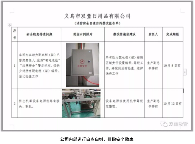 此次重大火災事故發(fā)生后,瞬間引發(fā)了“雙童”強烈危機感,所有“雙童”人深刻意識到安全的重要性!安全工作已經(jīng)迫在眉睫,雖然事故發(fā)生后恰逢國慶員工放假期間,“雙童”安全工作也在緊鑼密鼓的開(kāi)展,廠(chǎng)區內安排了值班人員,每天開(kāi)展安全排查等工作,進(jìn)行自查自糾,并邀請專(zhuān)家到公司做安全指導工作?!半p童”在安全排查期間,共計發(fā)現了39項安全隱患,明確責任人和改進(jìn)期限,杜絕安全隱患!