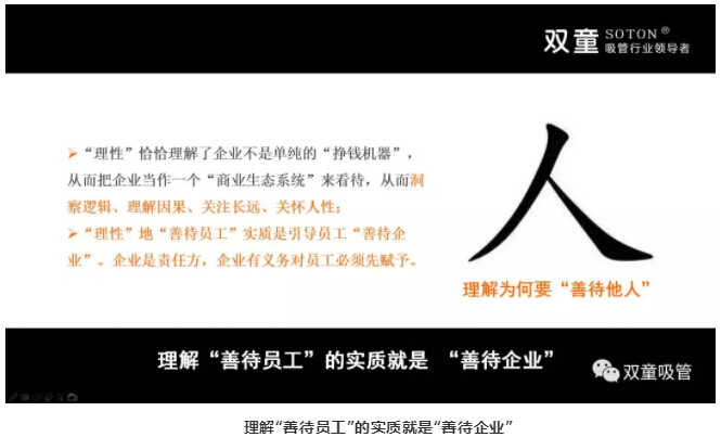 當你用“利他”去交換“利己”時(shí),本質(zhì)還是商業(yè),還是西方理性科學(xué)當中的規則和規范。如果你解決了員工的困難,在未來(lái)某個(gè)時(shí)刻,一定會(huì )獲得他們的回饋。最終,“理性”地“善待員工”實(shí)質(zhì)是引導員工“善待企業(yè)”!