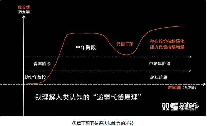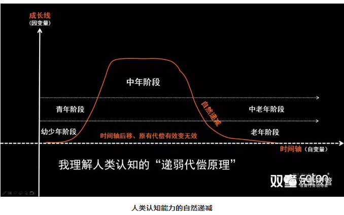 所以,我用一個(gè)“認知能力”思維模型給大家說(shuō)明:人類(lèi)發(fā)展中的成長(cháng)性是能夠無(wú)窮拓展的。比如正常來(lái)講,看一個(gè)人的認知能力,從幼年、少年、青年,到中年處于一個(gè)鼎盛階段,到中老年階段之后就進(jìn)入到自然遞減的過(guò)程。