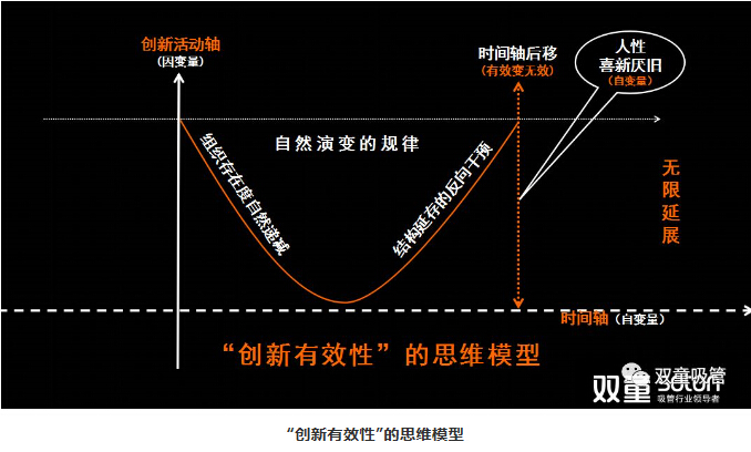 由此可以推導出,創(chuàng )新是創(chuàng )業(yè)活動(dòng)的前提,是不得不為之的“生存干預”。在這個(gè)干預過(guò)程當中大家要理解,它某種程度上是滿(mǎn)足人性的底層,它有一個(gè)不變的規律就是在時(shí)間軸后移的情況下創(chuàng )新有效變無(wú)效,所以創(chuàng )新是一個(gè)無(wú)限延展的過(guò)程。