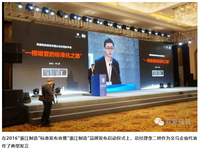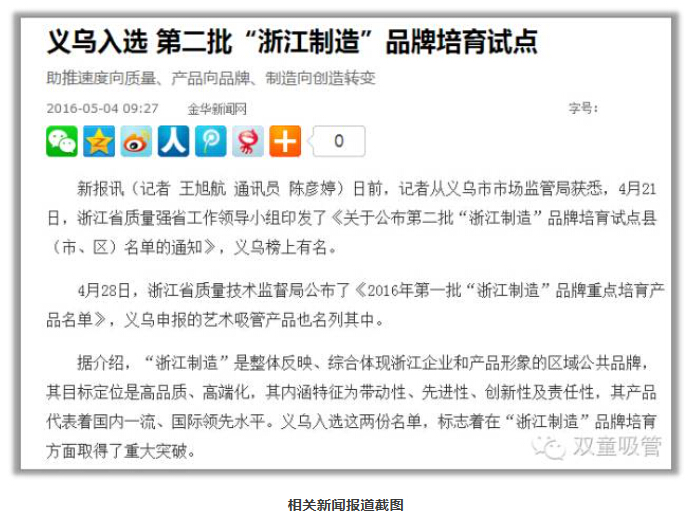 2016年4月28日,浙江省質(zhì)量技術(shù)監督局公布《2016年第一批“浙江制造”品牌重點(diǎn)培育產(chǎn)品名單》,“雙童”代表義烏申報的吸管產(chǎn)品名列其中。入選這份名單,標志著(zhù)義烏在“浙江制造”品牌培育方面取得了重大突破。