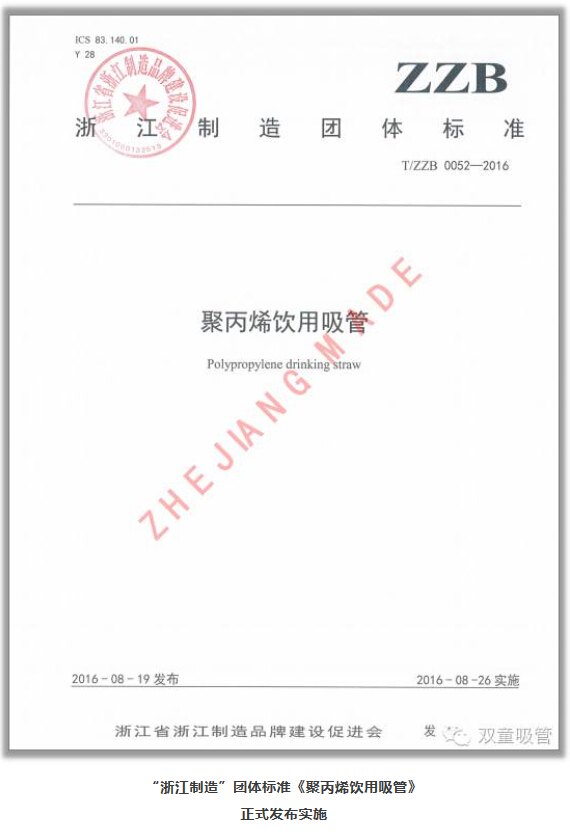 2016年年初,經(jīng)浙江省質(zhì)量技術(shù)監督局、浙江省標準化研究院等相關(guān)領(lǐng)導專(zhuān)家團隊多次論證,認為“聚丙烯飲用吸管”符合“浙江制造”定位要求,推動(dòng)聚丙烯飲用吸管品牌認證具有重大意義,決定將“聚丙烯飲用吸管”列入2016年“浙江制造”品牌認證目錄,并由“雙童”主導制訂“浙江制造”《聚丙烯飲用吸管》標準。