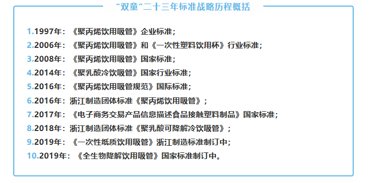 正是因為“雙童”持續主導吸管行業(yè)標準的制定,使得“雙童”始終站在行業(yè)的制高點(diǎn),直接推動(dòng)企業(yè)的品質(zhì)管理體系的建立、改善和提升,直接影響企業(yè)的品牌傳播,并最終獲得吸管產(chǎn)業(yè)的話(huà)語(yǔ)權、規則權和定價(jià)權,成為全球吸管行業(yè)的領(lǐng)導者!