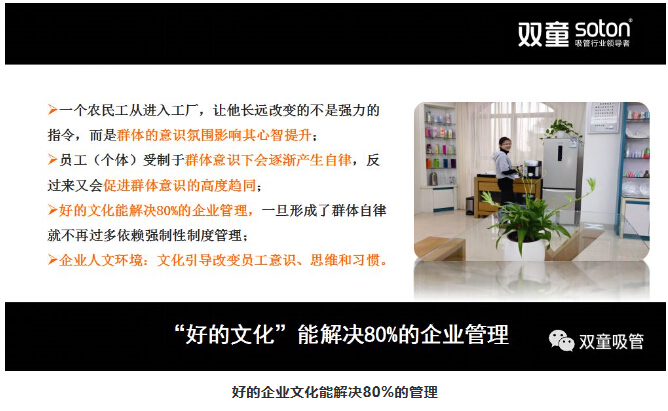 作為一個(gè)企業(yè)來(lái)說(shuō),企業(yè)的內核是企業(yè)文化和組織思維。企業(yè)文化分為顯性文化和隱性文化。“雙童”的花園式工廠(chǎng)、綠化環(huán)境、文化標語(yǔ)等都是表面的顯性文化。