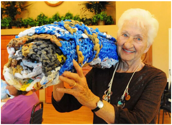 在美國奧馬哈,一群老奶奶把470年都降解不了的塑料袋,一點(diǎn)點(diǎn)清潔后織成“毛毯”……