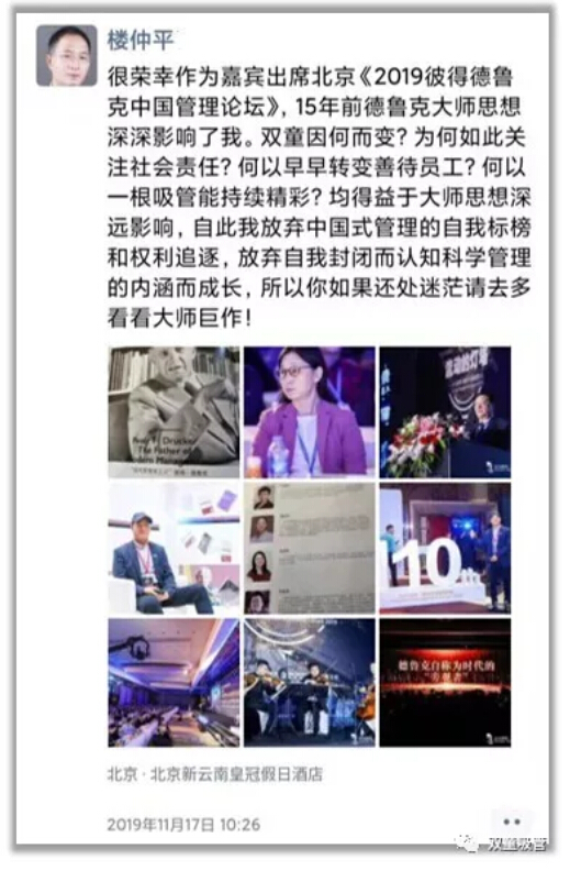 11月17日,“雙童”樓仲平作為受邀嘉賓出席了彼得·德魯克中國管理論壇。在論壇結束后,樓仲平在朋友圈發(fā)出了這樣的感嘆: