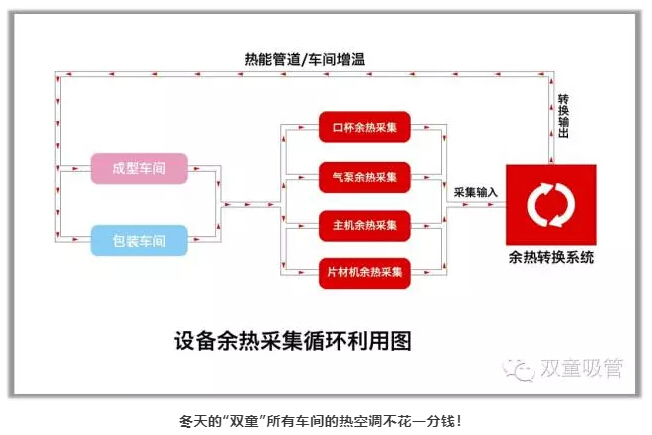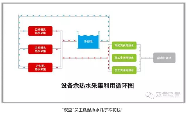“雙童”對所有經(jīng)過(guò)模具的50度溫水進(jìn)行收集,處理之后供應到所有寢室衛生間給員工洗澡洗衣生活之用。同時(shí),“雙童”對所有生產(chǎn)設備的余熱和廢氣進(jìn)行采集并回收,再通過(guò)空調管道輸送到需要加溫的各個(gè)車(chē)間和工段。通過(guò)上述方式,“雙童”光是在余熱水采集和設備余熱采集方面,每年就節省了150多萬(wàn)元,消滅了企業(yè)產(chǎn)生的污染和排放!