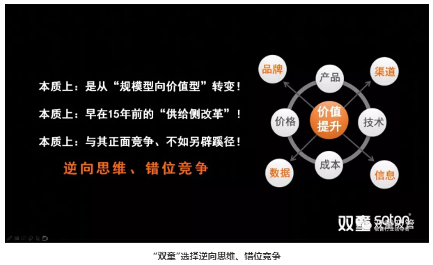 實(shí)際上,“雙童”推動(dòng)此次改革就是讓企業(yè)從“規模型向價(jià)值型”轉變,從而打破原來(lái)產(chǎn)業(yè)的邊界,拓展了原本產(chǎn)業(yè)內被忽視的顧客群體和顧客需求,這本質(zhì)上就是錯位競爭,與其正面競爭、不如另辟蹊徑!這也正是迎合了近年來(lái)不斷被提倡的“供給側改革”,無(wú)非是“雙童”早做了15年。