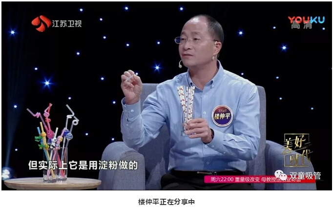 在“雙童”樓仲平上場(chǎng)后,主持人趙丹軍就被桌子上的各類(lèi)吸管所吸引啦!樓仲平也向在場(chǎng)觀(guān)眾介紹了美觀(guān)環(huán)保的可降解吸管和極具特色的創(chuàng )新吸管。