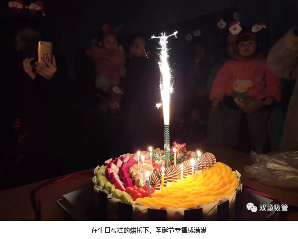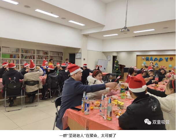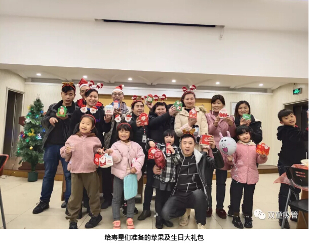 快看,壽星們人手一個(gè)平安果,頭上還有一頂可愛(ài)的圣誕帽子,可愛(ài)極了!乍一看,還以為是一群圣誕老人在聚會(huì )呢!