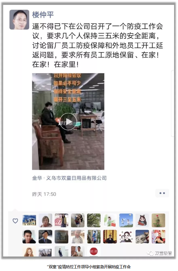 “雙童”樓仲平則當起了朋友圈大喇叭,不斷提醒員工們緩返義烏,在家休息,不要輕信并傳播謠言。
