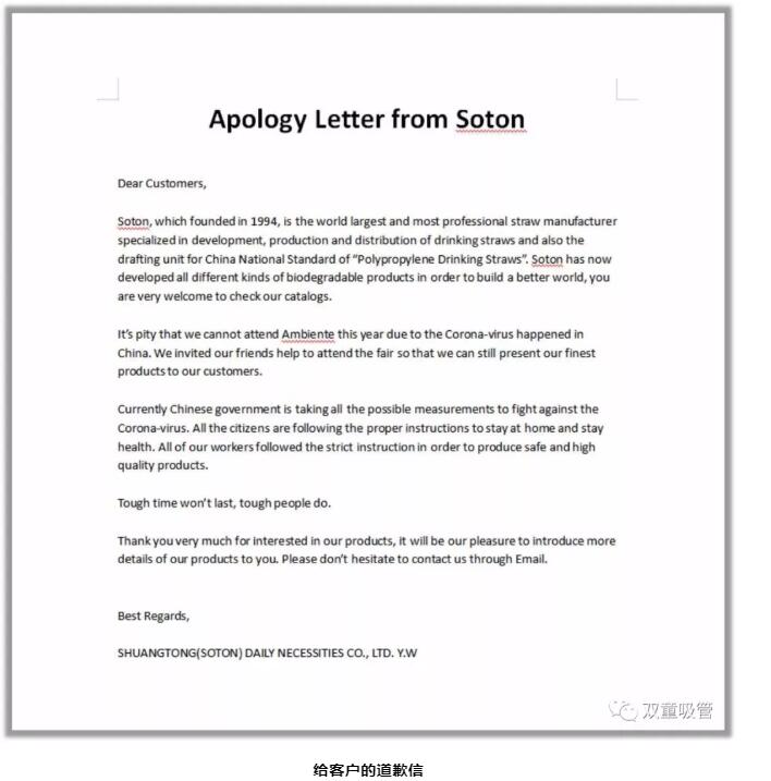 開(kāi)展后,我們也遭遇了一大難題。由于中國疫情原因,客戶(hù)對中國館充滿(mǎn)顧慮,甚至不愿意走進(jìn)攤位中和業(yè)務(wù)員溝通。此時(shí),“雙童”團隊寫(xiě)了一封給客戶(hù)的道歉信(介紹雙童基本情況、不能親臨現場(chǎng)的原因),并粘貼客戶(hù)告知書(shū)(告知兩位業(yè)務(wù)員是長(cháng)期在德留學(xué)生,短期內未回過(guò)中國),從而消除了客戶(hù)們的顧慮。