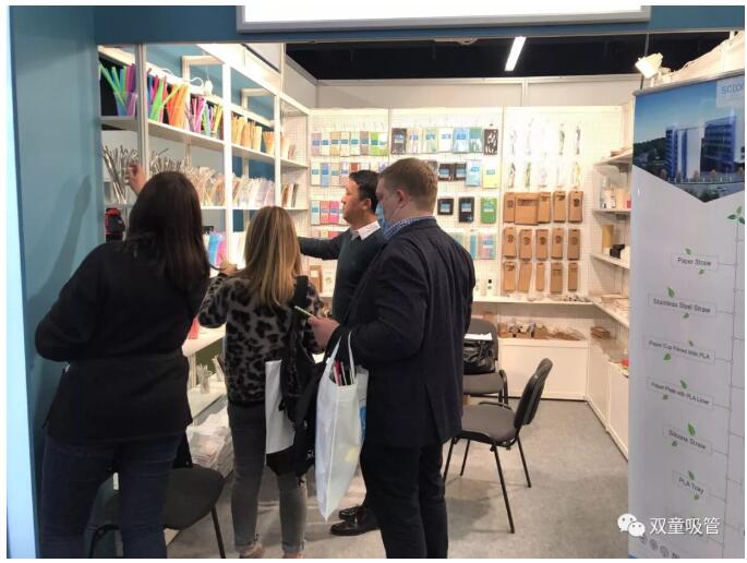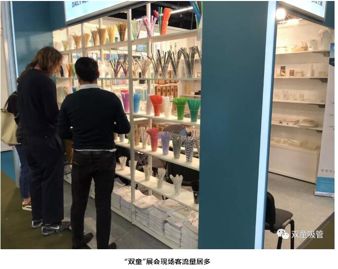 展會(huì )期間,盡管中國館的參展商不多,但每天都有絡(luò )繹不絕來(lái)自全球各地的參展商到“雙童”展位駐足洽談,對“雙童”的各類(lèi)吸管、可降解材質(zhì)包裝盒等產(chǎn)品表示了濃厚的興趣。