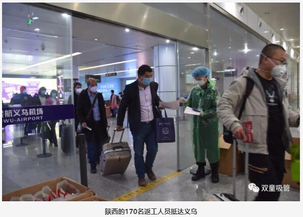 “義烏,我們回來(lái)了!”2月24日下午15:40,“雙童”的五位員工乘坐了一架從陜西省漢中市駛出的“義烏復工返崗專(zhuān)機”抵達義烏。