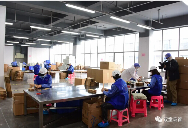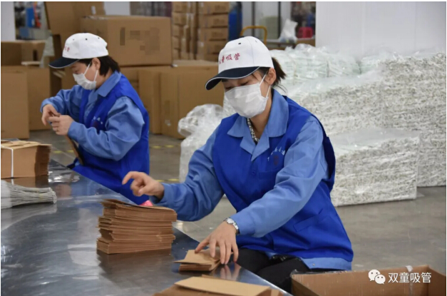 從2月25日開(kāi)始,上崗的工會(huì )機關(guān)干部、婦聯(lián)志愿者相繼來(lái)到“雙童”,經(jīng)過(guò)測量體溫、消毒登記、查看健康碼、更衣?lián)Q帽等一系列防疫流程后,進(jìn)入了包裝車(chē)間。