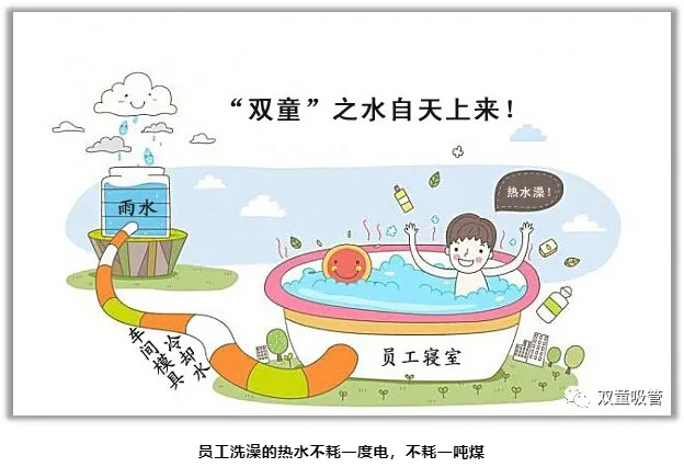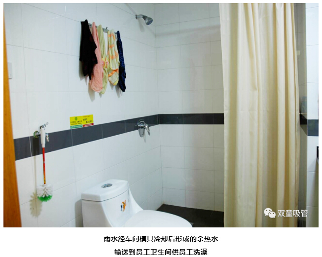 這些雨水在經(jīng)過(guò)過(guò)濾后就可以作為消防用水、車(chē)間模具冷卻用水!最神奇的是,“雙童”員工洗澡的熱水不耗一度電,不耗一噸煤,全部是收集好的雨水經(jīng)車(chē)間模具冷卻后形成的余熱水哦!