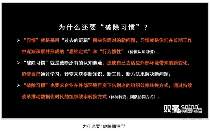 為什么要破除慣性呢?因為習慣就是采用“過(guò)去的邏輯”解決你面對的新問(wèn)題,是大家在長(cháng)期工作中逐漸積累并形成的“思維定式”和“行為慣性”。