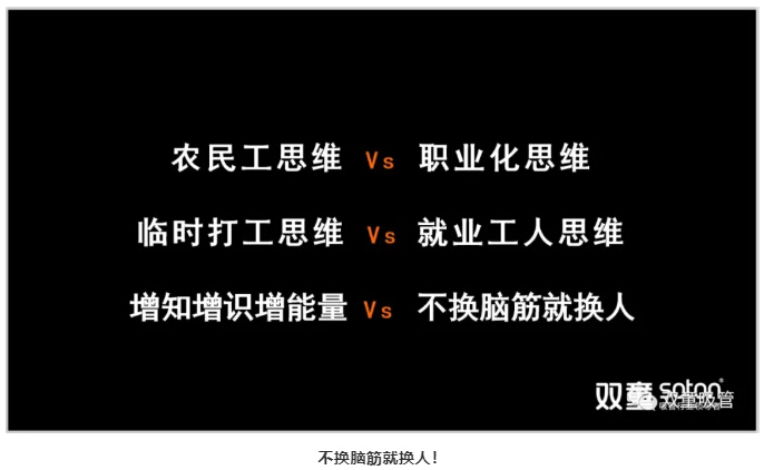 那么,“更換腦筋”就是要讓管理者從“農民工思維”轉換為“職業(yè)化思維”,從“臨時(shí)打工思維”轉換為“就業(yè)工人思維”,徹底改變管理者“有事找領(lǐng)導、解決等指令”的惰性家長(cháng)式管理方式,提高團隊尋找問(wèn)題、發(fā)現問(wèn)題以及主動(dòng)解決問(wèn)題的能力,從而提升組織效率,以適應這個(gè)不斷變化的時(shí)代。