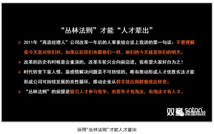 如今時(shí)代轉變下,靠人情、感情解決問(wèn)題是不可持續的,唯有吸引人才參與競爭,推動(dòng)人才優(yōu)勝劣汰,才能形成公司可持續發(fā)展的良性循環(huán),推動(dòng)企業(yè)從群羊效應到群狼效應轉變。所以,公司里的每一個(gè)人,也應該作出轉變,破除慣性、轉換思維、提高效率,否則都將在激烈的人才競爭中被淘汰!