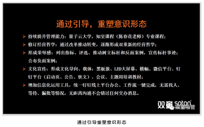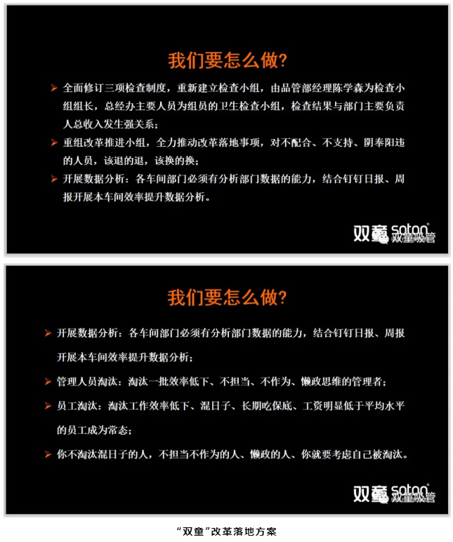 在樓仲平分享結束后,總經(jīng)理李二橋和大家分享了全面圍繞提升組織效率而展開(kāi)的改革落地方案,包括重建“雙童”改革小組和安全衛生秩序檢查小組、形成崗位競爭推動(dòng)優(yōu)勝劣汰、推動(dòng)車(chē)間數據分析能力、全面做好改革宣傳工作和文化引導工作、結合線(xiàn)上辦公平臺提升企業(yè)信息化水平等,在企業(yè)內部建立起“以奉獻者為先、以?shī)^斗者為本”的新時(shí)代價(jià)值觀(guān)!