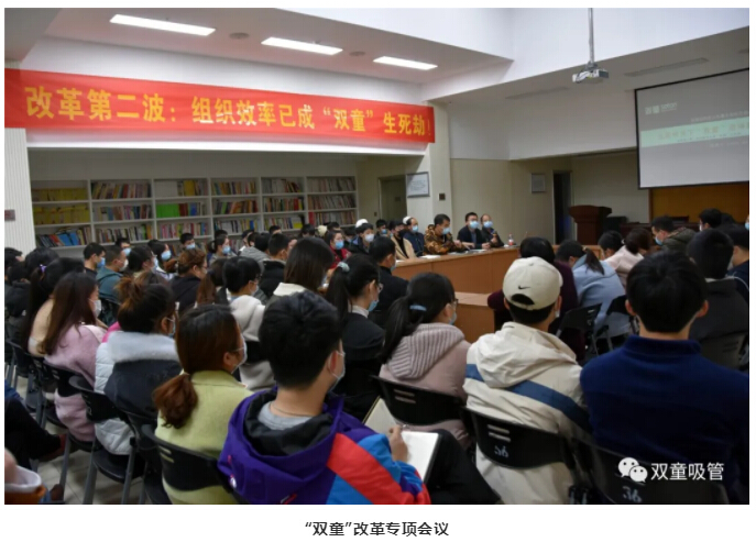 2020年4月2日,“雙童”推動(dòng)企業(yè)第二波改革活動(dòng),提出“組織效率已成雙童生死劫”!在改革動(dòng)員大會(huì )中,樓仲平一再強調:“‘雙童’不是你的家、沒(méi)有‘動(dòng)力’請回家!”
