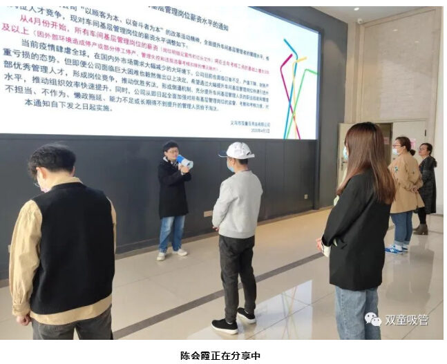 每周二、周三,是“雙童”人的學(xué)習日,以往早會(huì )的參與人員是全體行政人員,今年車(chē)間的基層管理崗位也加入了行政早會(huì )的隊伍里,通過(guò)行政人員的帶領(lǐng),讓基層管理也能在參與的同時(shí)不斷提升自我。