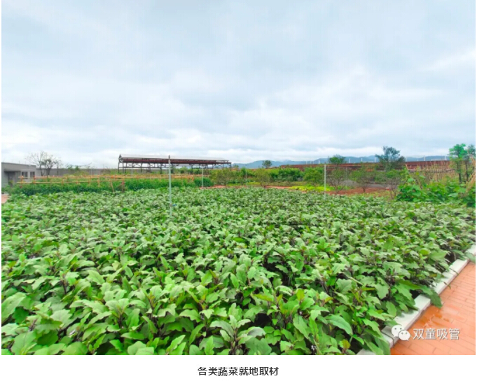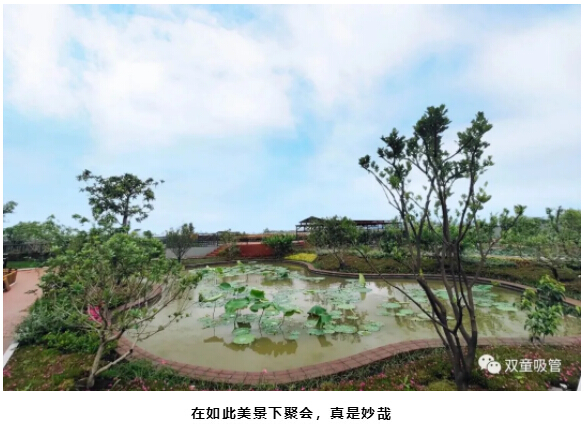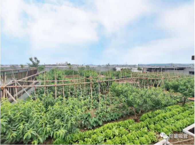 看!聚會(huì )的地點(diǎn)就在“雙童”新廠(chǎng)房5000平米的“屋頂果園”及空中學(xué)習吧,200多棵果樹(shù)茁壯成長(cháng),還有菜地、池塘、藕塘、百花池等,瓜果蔬菜……晚餐的食材大部分可以就地取材,真是太贊啦!